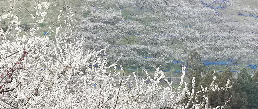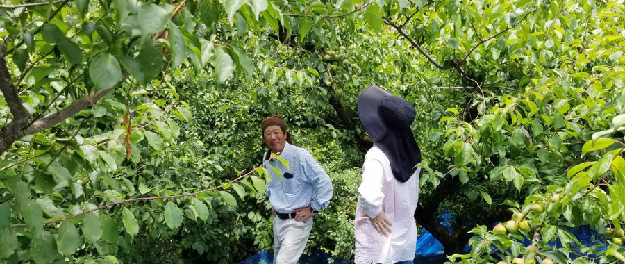 急傾斜地に梅が植えられていて、梅畑周辺には薪炭林としてウバメガシなどの木があり、日本みつばちが飛び交っています。その光景は、2015年に登録された世界農業遺産『みなべ・田辺の梅システム』そのものです。昔からの梅づくりの景色が広がっています。