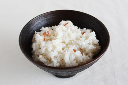 - ご飯が炊きあがったら、梅干の果肉をほぐして混ぜる。(種は取り除く)